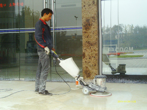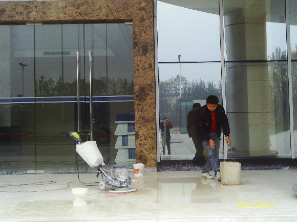 再到80年代末,緣自歐洲程序的一種工藝,“晶面處理系統”于90年代推進中國市場。這個系統就是針對水蠟工藝上硬度、光澤、清澈度不夠及工藝復雜等不足改良而成的,其工藝原理就是在石材投入使用及未受磨損前,以幾種水晶加強劑配合機械,利用石塊籍壓于熱力產生之化學作用,先將石材表層下的氣孔封閉,使其污垢不能滲入,同時表層上加上幾層熱處理保護層,起到增加石材表面的硬度和光度,更有防滑之功效,石質原有天然色澤得到帶出及全面性保護,保持度教一般水蠟高幾倍。長期使用,耗用的人力物料成本較水蠟低,無須每天補蠟及定期起蠟等復雜工序,此工藝為目前大理石保養及翻新后晶面的理想工藝,我們稱為石材打蠟第三代。