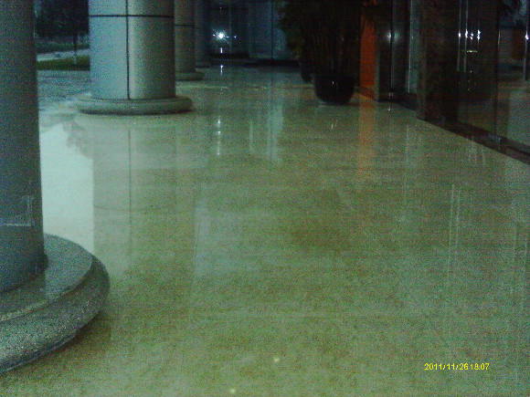 到了70年代末,一種可塑性水溶性結晶聚合物的誕生,亦即是現今常說的水蠟,進化了石材護理的歷史,可以利用這種物質對不同材質的大理石進行護理。分底蠟(封蠟),面蠟(拋光蠟)及保養蠟(日常修補蠟)是對大理石的塑層進行保護并利用高速拋光來增亮,對石材的保護起到一定的作用。但是這種水蠟不足之處是蠟層的硬度有限,稍欠保養,腳步帶進的塵土將很容易把蠟層及石材磨花。同時,遇上雨水季節,因室外雨水塵埃會有一定的雜質,通過人的腳步帶進后,對蠟層的分子組成將造成一定的影響。直觀看到是蠟層變黃及缺光澤,也就是以后常見到的許多客戶為什么須經常將腐蝕的蠟層用起蠟水脫去,再重新分工序打上底蠟和面蠟,每次的工作量及耗用的物料較大,這種工藝現市場上很普通,我們稱為石材打蠟第二代。